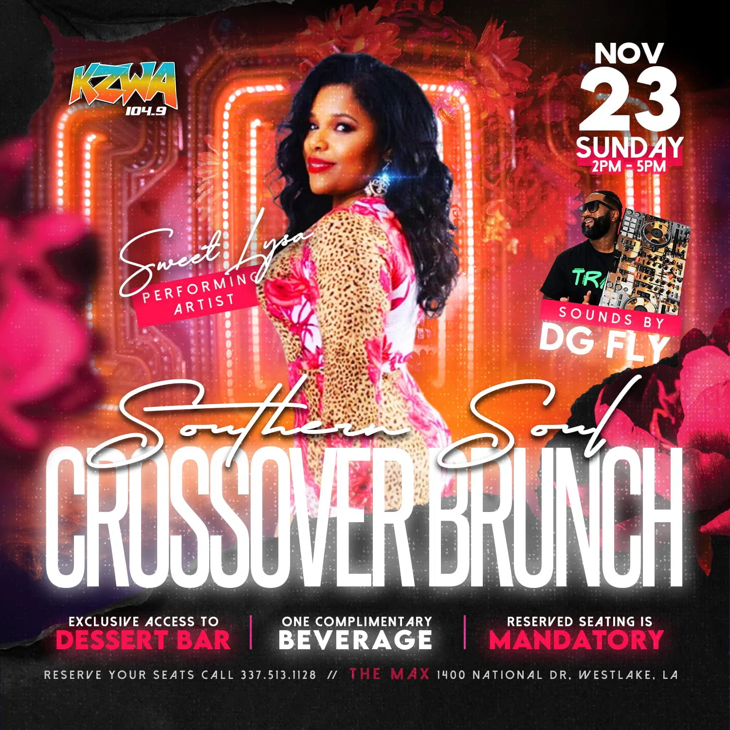 KZWA 104.9 Southern Soul Crossover Brunch featuring Performing Artist “Sweet Lysa” with sounds by DG Fly, Sunday, November 23, 2025, 2 pm – 5 pm at The Max, 1400 National Dr., Westlake, LA. Exclusive access to the Dessert Bar and one complimentary beverage. Reserved seating is mandatory. Reserve your seats, call 337-513-1128 today.