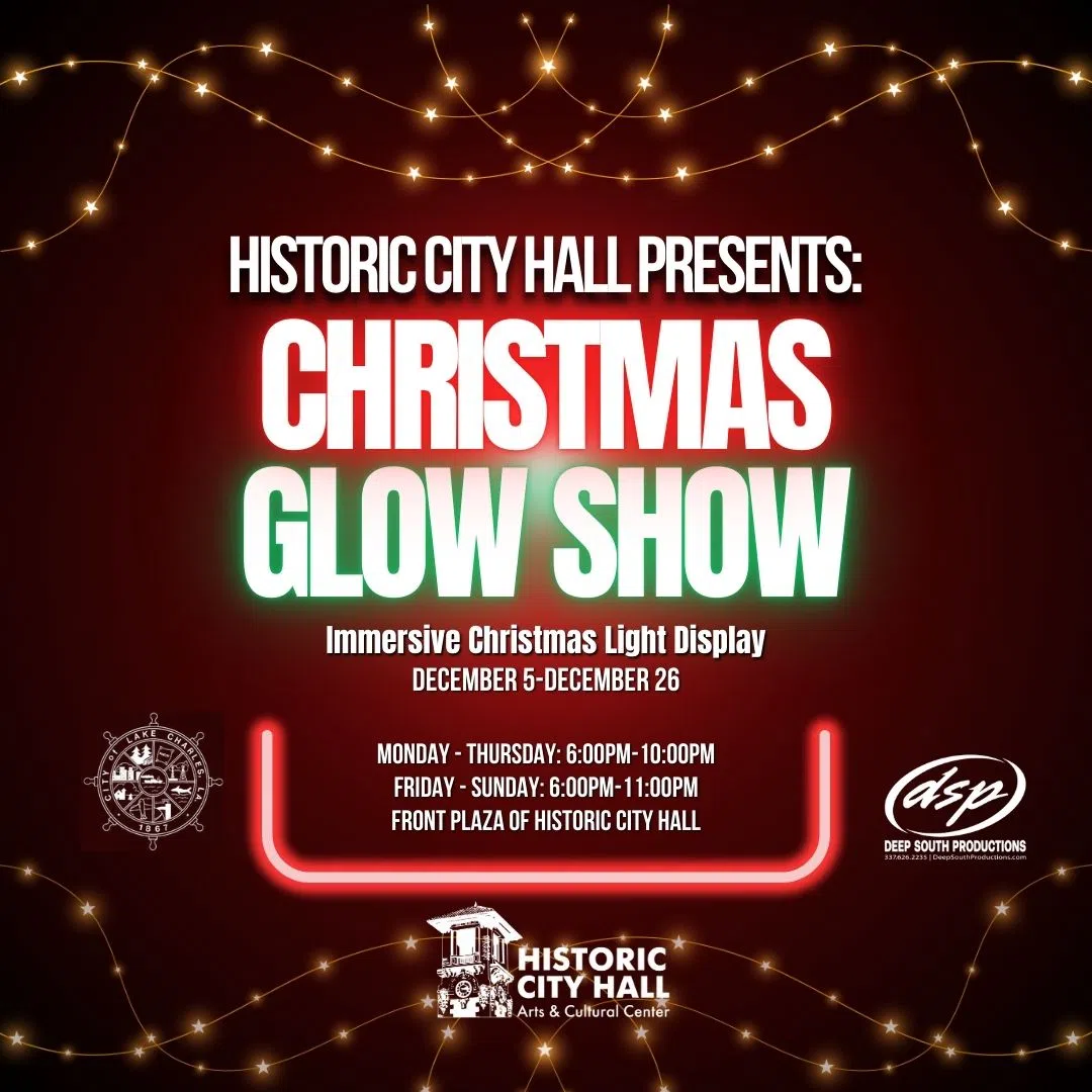 “Lake Charles, get ready for the Christmas Glow Show at Historic City Hall! From December 5th through the 26th, enjoy peaceful holiday displays Monday through Thursday from 6 to 10 PM, and dazzling 20-minute animated shows Friday through Sunday from 6 to 11 PM. It’s free, magical, and perfect for family nights, date nights, or a festive downtown stroll. Dress warm, bring your holiday cheer, and experience the Glow Show on the front lawn of Historic City Hall, 1001 Ryan Street. Don’t miss it!”